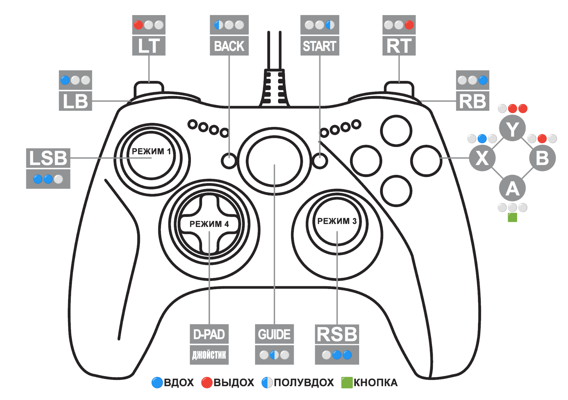 В базовом профиле Default Configuration есть 5 режимов управления. Особенно интересен второй режим с комбинированием левого и правого стика геймпада — движения мундштука вверх и вниз задействуют левый стик, а влево и вправо задействуют правый стик. В этом режиме удобно двигаться и поворачиваться в игре. Управление мышью доступно, если играть на ПК.